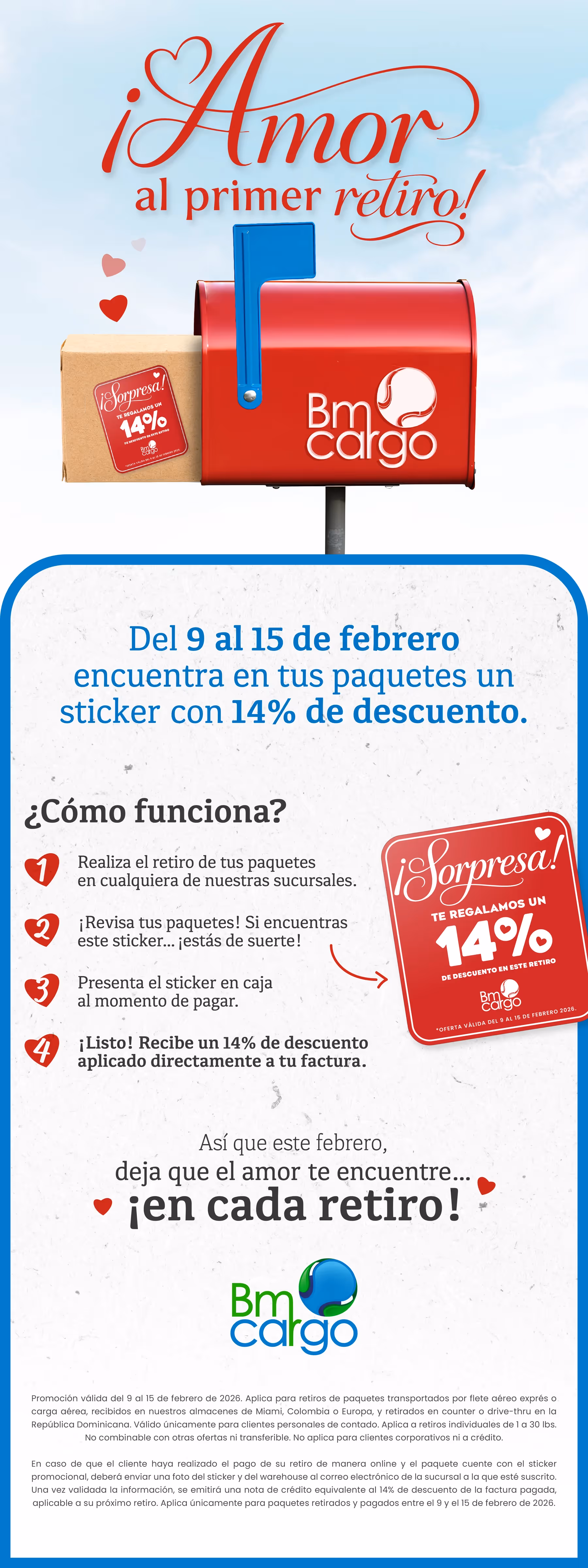 *Promoción válida del 9 al 15 de febrero de 2026. Aplica para retiros de paquetes transportados por flete aéreo exprés o carga aérea, recibidos en nuestros almacenes de Miami, Colombia o Europa, y retirados en counter o drive-thru en la República Dominicana. Válido únicamente para clientes personales de contado. Aplica a retiros individuales de 1 a 30 Ibs.