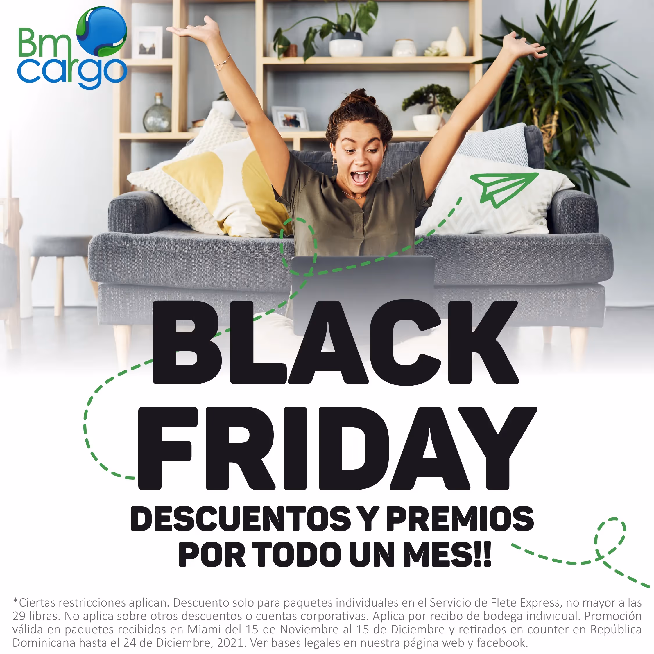 a) La responsabilidad del Patrocinador culmina al momento de la debida entrega del premio. b) BMCARGO no autoriza el derecho de aprobar la transferencia de este premio a un tercero. c) Si el favorecido no acepta el premio o sus condiciones se considerará que ha renunciado a éste y quedará extinguida totalmente cualquier obligación del Patrocinador frente al favorecido, a quien no le asistirá derecho a reclamo o indemnización alguna, ni siquiera de modo parcial. En caso de esta negativa, ella se hará constar en un acto notarial que se instrumentará al efecto. d) Se hace constar que el premio no incluye la adquisición u ofrecimiento de bienes y/o servicios distintos a los estipulados en estas bases. e) Las empresas, empleados y/o demás relacionados de BMCARGO, no son responsables de la falta de retiro del premio en el tiempo estimado. El ganador no podrá tampoco ejercer ningún tipo de acción legal por este concepto contra cualquiera de los empleados y/o representantes de las marcas o empresas anteriormente mencionadas ni sus respectivos afiliados, accionistas, directores y funcionarios. F) Este descuento no aplica sobre otros descuentos o promociones; Solo para clientes personales; Oferta Válida para República Dominicana; Descuento solo para paquetes individuales en el Servicio de Flete Express; Aplica por recibo de bodega individual; Mercancía recibida en Miami del 15 de noviembre hasta el 15 de diciembre y retirados en República Dominicana en counter hasta el 24 de diciembre.